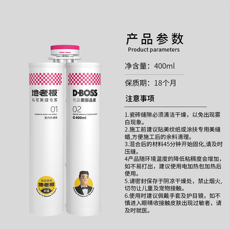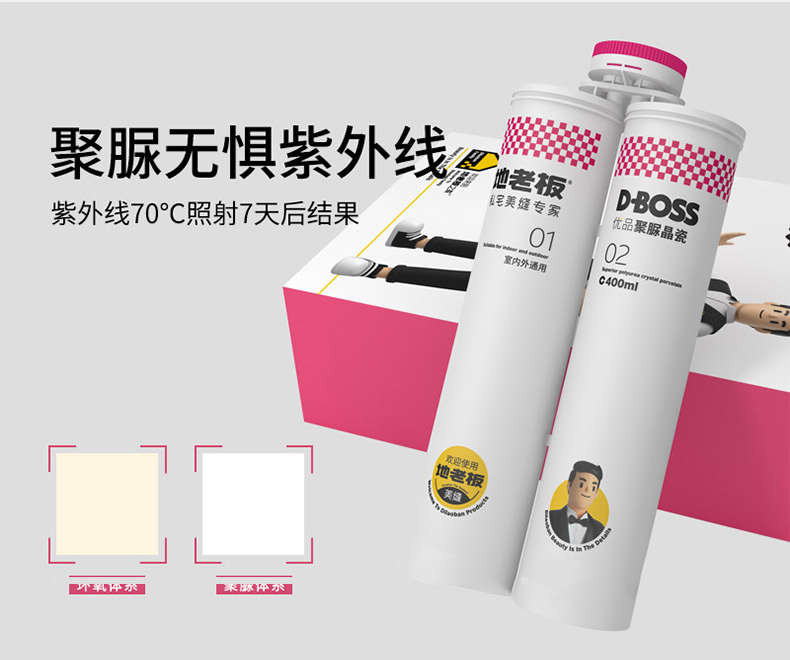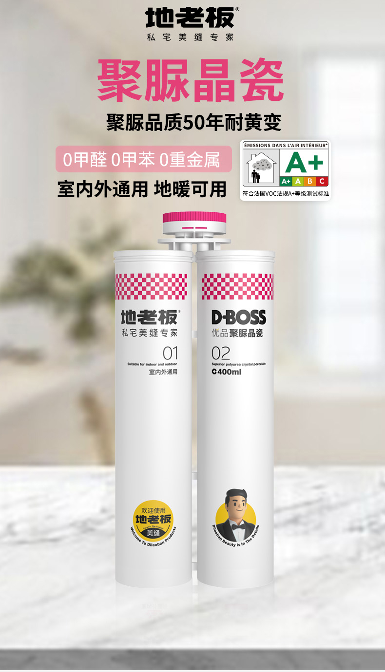 地老板?優品聚脲美縫劑由聚天門冬氨酸酯聚脲聚合物、高級化妝品級顏料精制而成的瓷磚美縫產品。聚天門冬氨酸酯聚脲美縫劑簡稱聚脲美縫劑,具有更好的柔韌性及耐紫外線能力,使瓷磚美縫耐磨損、耐老化、更堅固,保障長久不失光澤、不變色。本產品嚴格按照《GB18583-2008室內裝飾裝修材料膠粘劑中有害物質限量》標準執行,通過ISO9001:2015質量管理體系認證、歐盟SGS產品質量檢測、CE安全產品認證及法國室內環境檢測A+認證,綠色環保,無毒無味。