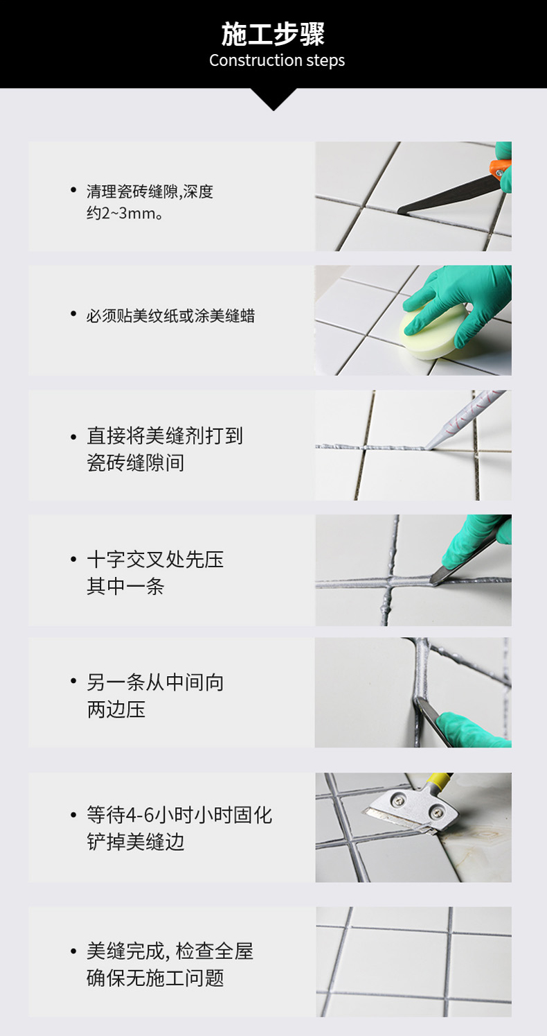7.護理。常溫25℃以下,20分鐘表干,6小時基本固化,12小時以上完全固化。自然養護7天。美縫后24小時內要避免受到污染、雨淋、水沖、踩踏等。