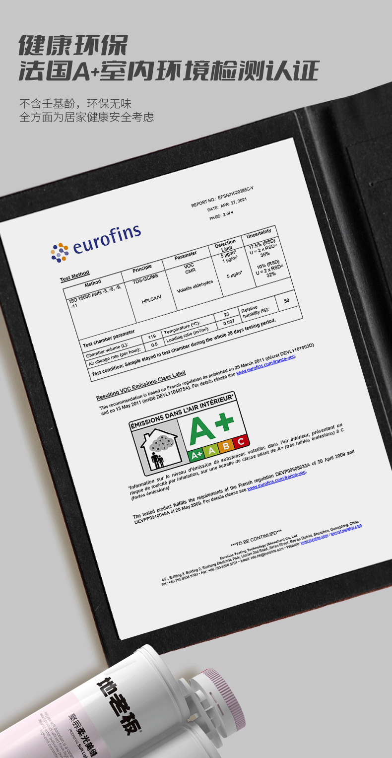 產品承諾:通過法國室內環(huán)境檢測A+認證 歐盟SGS、CE環(huán)保產品認證